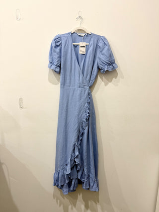 & Other Stories Puff Sleeve Surplice V-Neck Ruffle Trim Wrap Dress Blue Womens 8