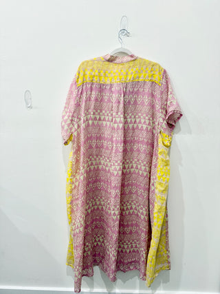 Yvonne S Patterned 100% Linen Short Sleeve Kaftan Dress Pink/Yellow Women's M