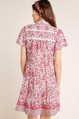 By Anthropologie Floral Eyelet Ruffle Trim Mini Shirtdress Cream/Pink Women's S