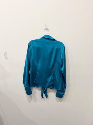Finley Lindy Satin Long Sleeve Tie Front Button-Front Shirt Aqua Blue Womens M