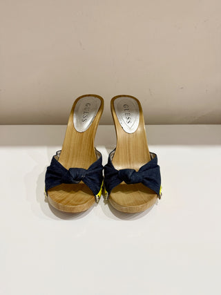 Guess Denim Slip On Wooden Mules Heels Brown/Blue with Yellow Trim Women Size 6