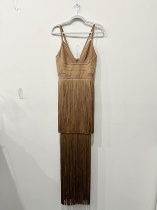 Hervé Léger Sleeveless Plunging Fringe Bandage Maxi Gown Light Brown Women Small