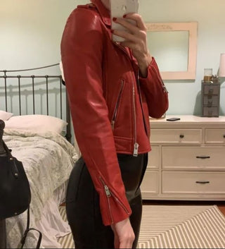 Lamarque Donna Asymmetric Zip Iconic Leather Biker Jacket Red Womens Size Medium