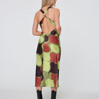 NWT Another Girl Satin Circle Trim Halter Midi Slip Dress Green/Brown Women's 6