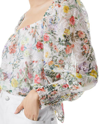 NWT Alice & Olivia Rowa Floral Eyelet Puff Sleeve Square Neck Blouse White Large