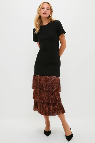NWT Hyacinth House Metallic Fringe Francie Maxi Dress Black/Bronze Women's Large