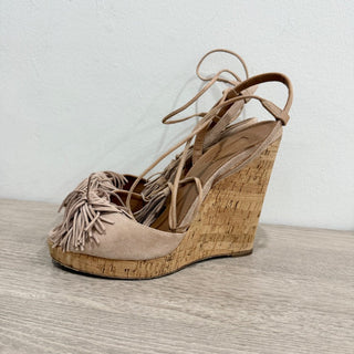 Aquazzura Wild One Suede Cork Tassel Wedge Sandals Vintage Pink Women's EU 39