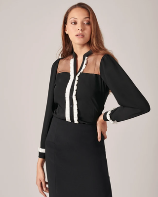 Anne Fontaine Laley Button-Up Tunic Shirt with Sheer Yoke Black/White Women 40/8