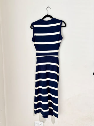 Tanya Taylor navy blue white striped jersey ruched midi dress, S