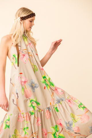 Tibi Linnea Floral Poplin Leather Halter Midi Swing Dress Hazelwood Women's 0