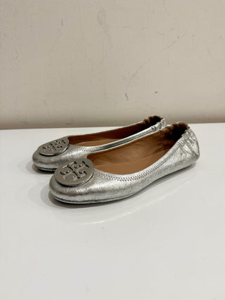 Tory Burch Metallic Leather Slip On Scrunch Ballet Flats Silver Women's Size 7