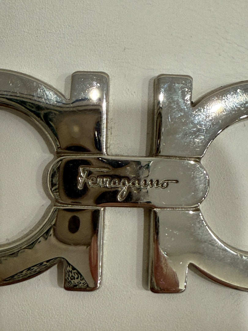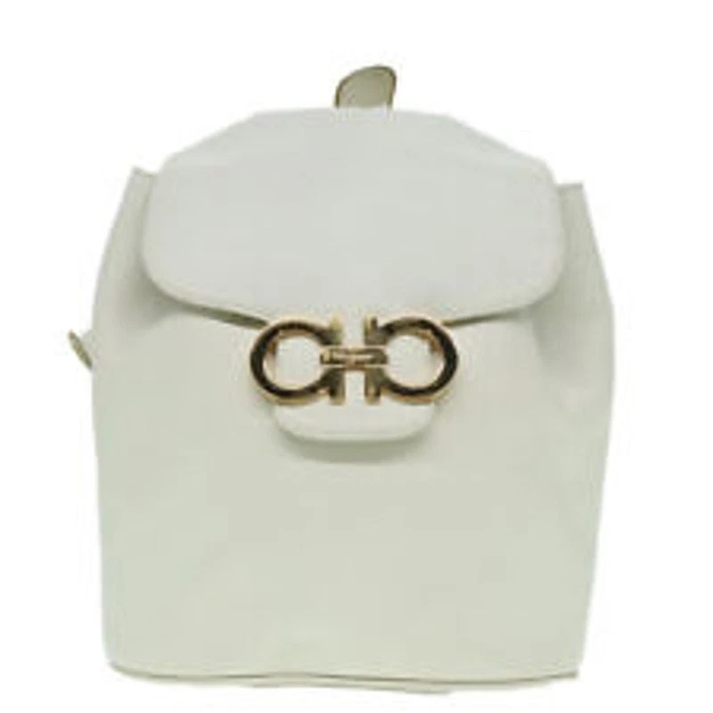 This refined leather backpack features Salvatore Ferragamo’s signature Gancini detail with a drawstring closure in white and silver tones, blending elegance with everyday functionality.