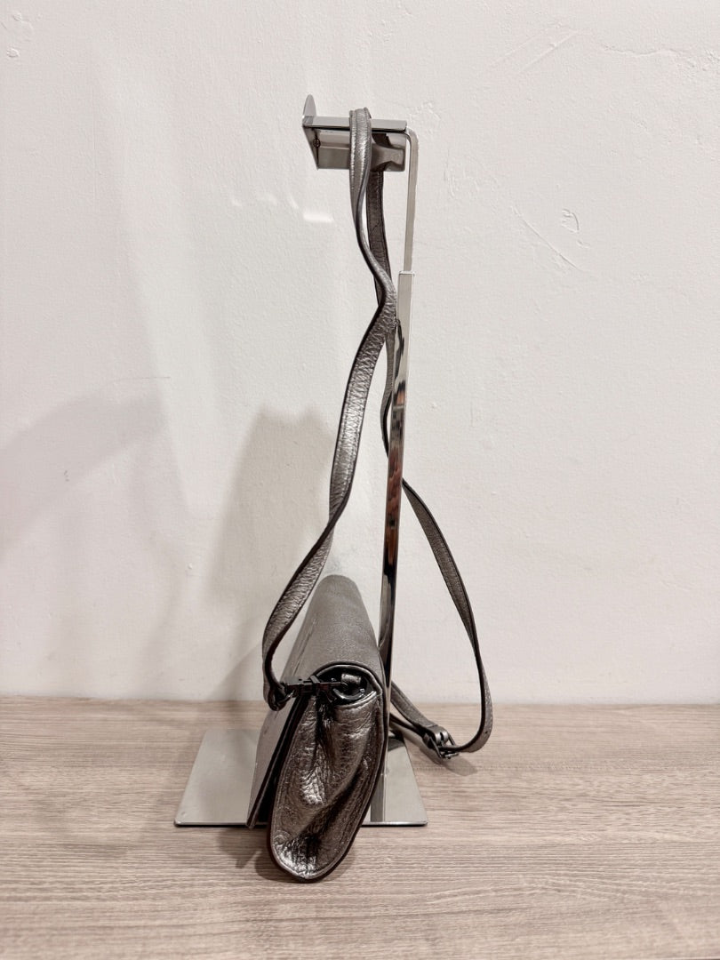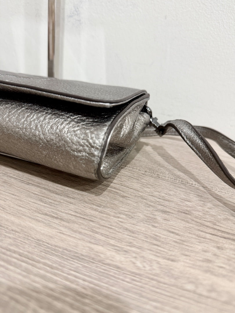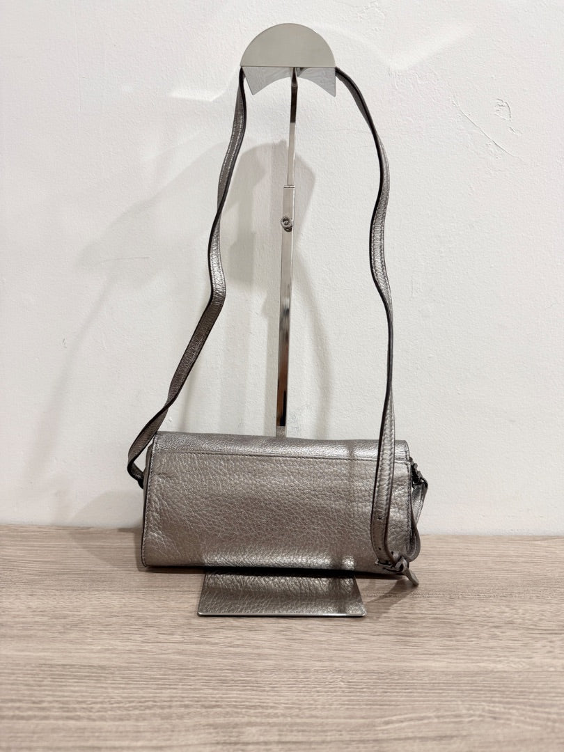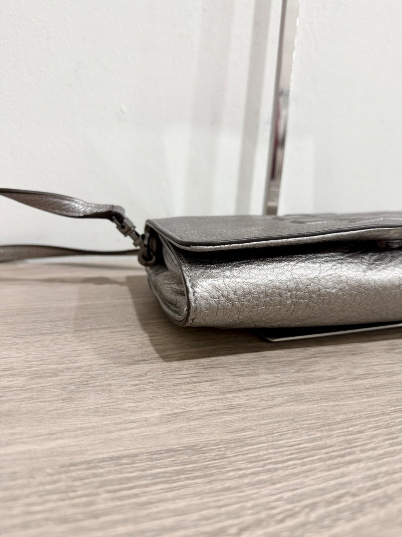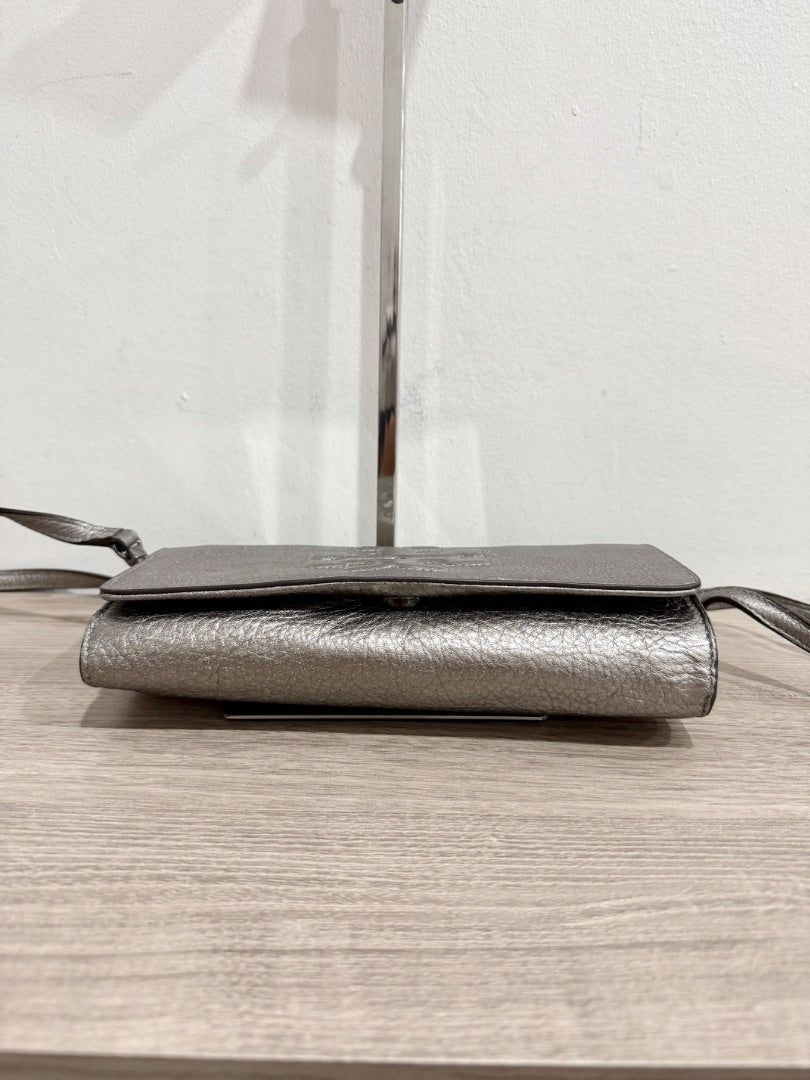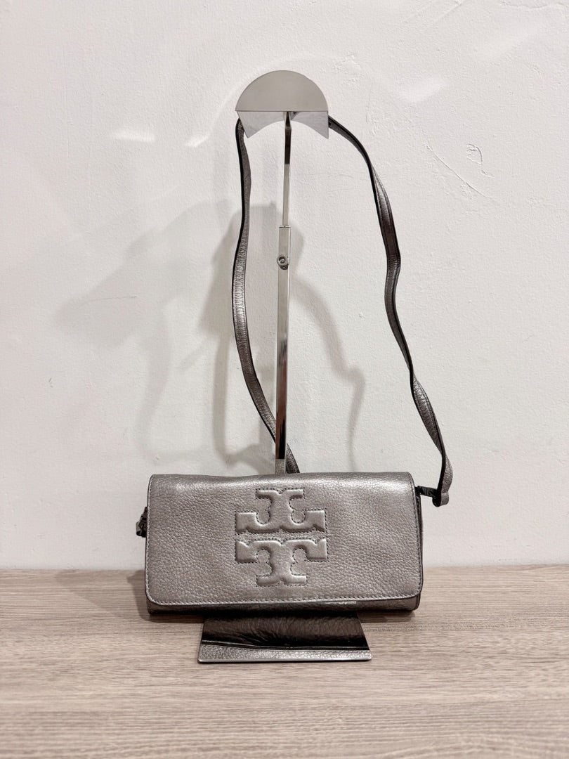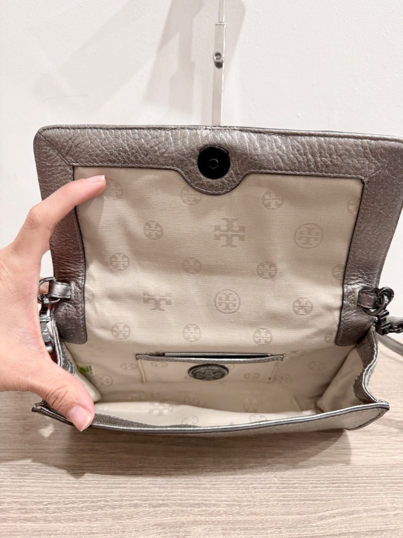 Tory Burch platinum metallic logo embossed small shoulder bag