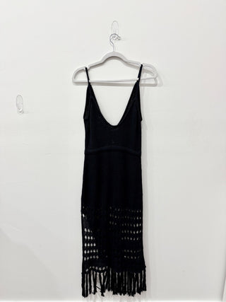 Nikkis Beach House Open Knit Crochet Cover-Up Maxi Dress w/ Fringe Trim Black XS