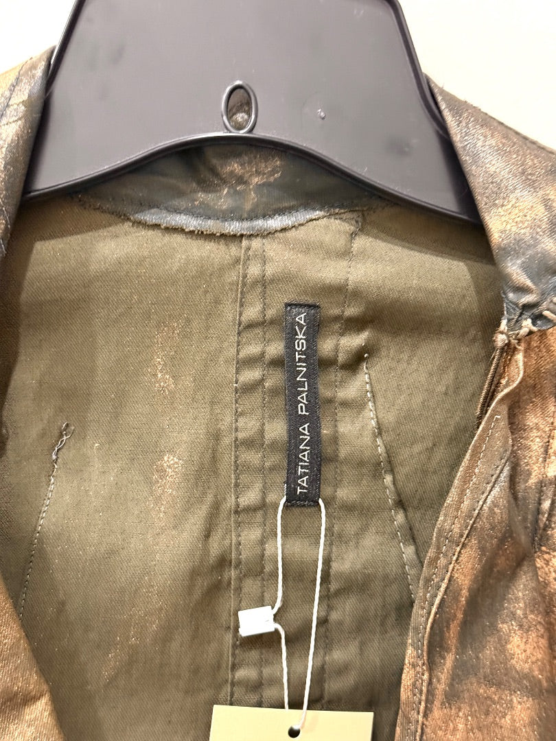 This Tatiana Palnitzka matching set features a tailored blazer and mini skirt in navy green with gold accents, offering a sophisticated and polished ensemble perfect for chic day-to-night styling