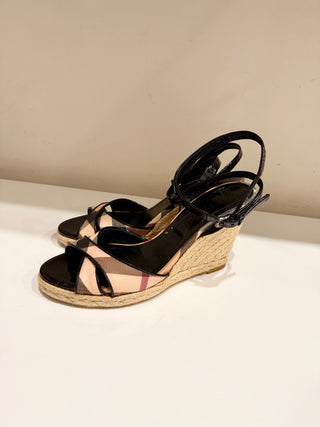Burberry Espadrille & Patent Leather Check Ankle Strap Wedge Sandals Black EU 39