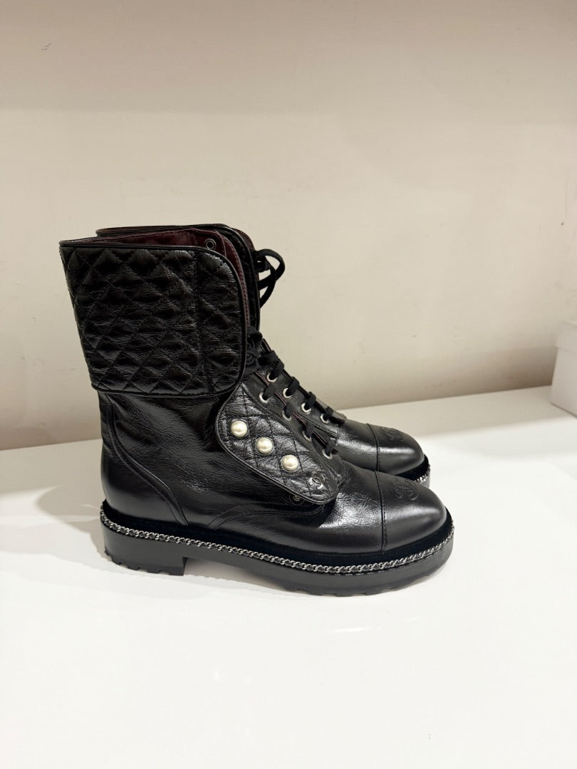 Striking and iconic, these CHANEL mid-calf combat boots are crafted from glossy black patent leather with signature quilted detailing. Finished with elegant CC pearl accents, they blend edgy combat styling with timeless Chanel luxury.