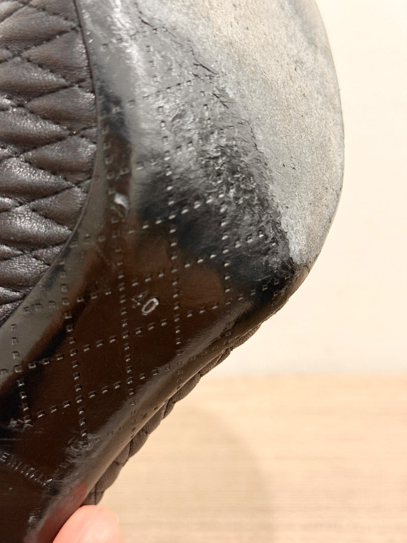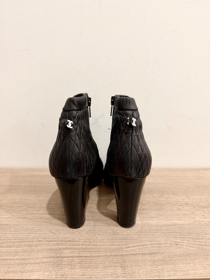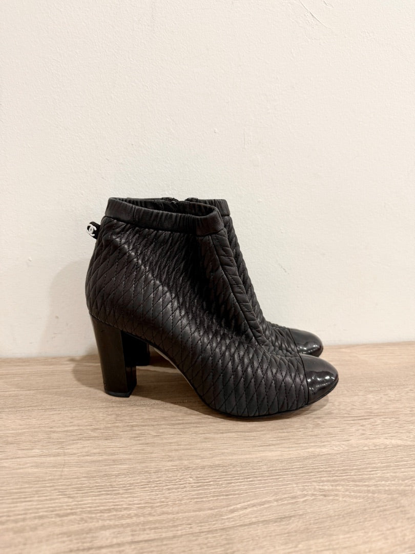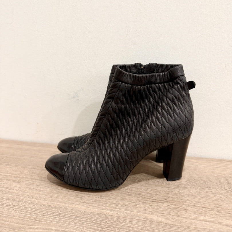 Chanel Leather Block Heel Cap Toe Quilted Ankle Booties Black Women's Size EU 40