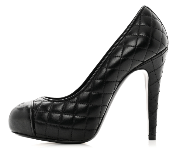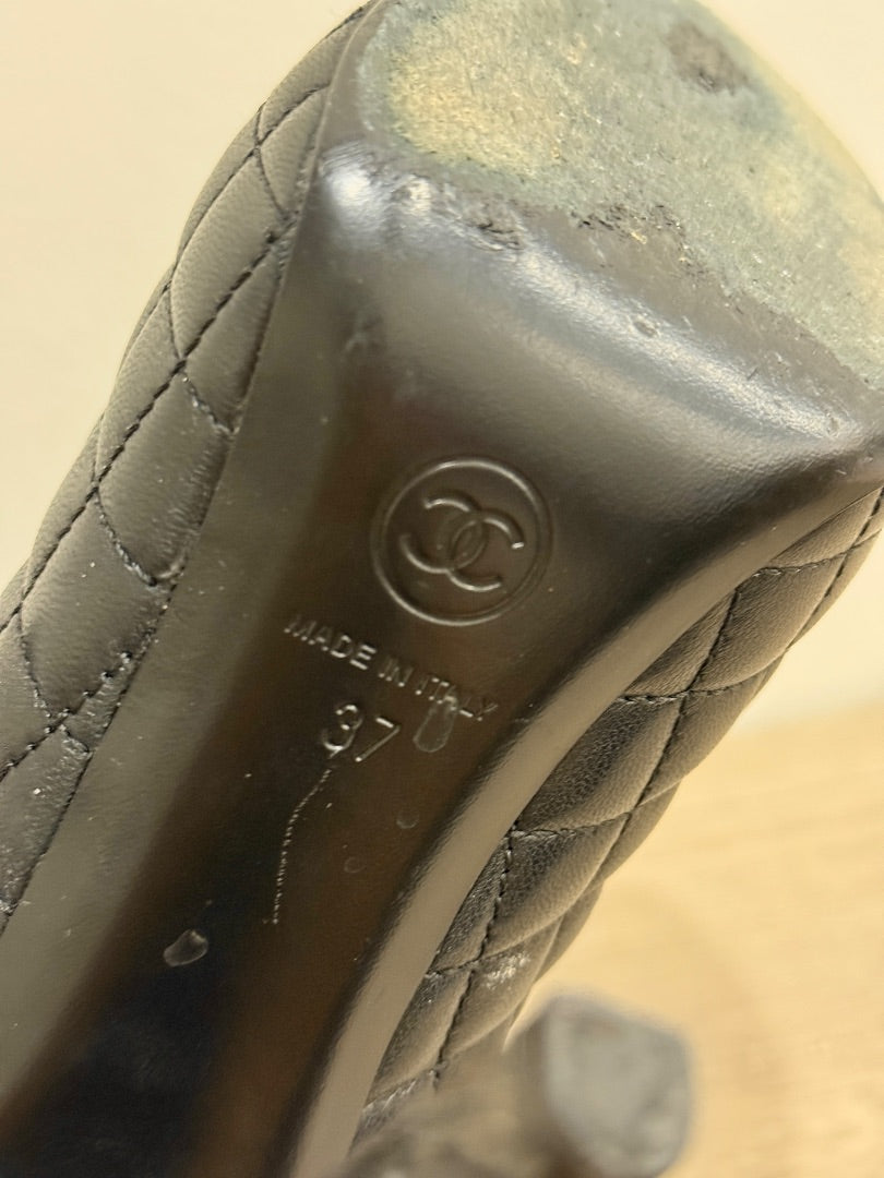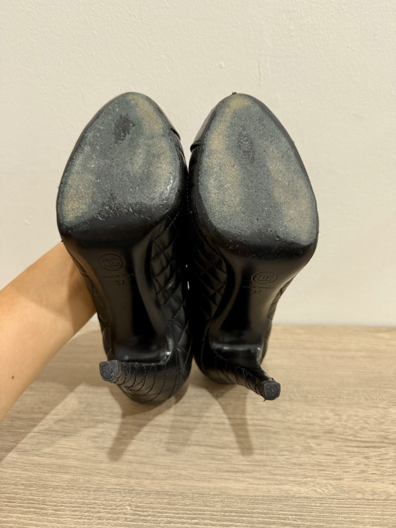 Chanel Quilted Leather Platform CC Logo Cap Toe Stilettos Heel Pumps Black EU 37