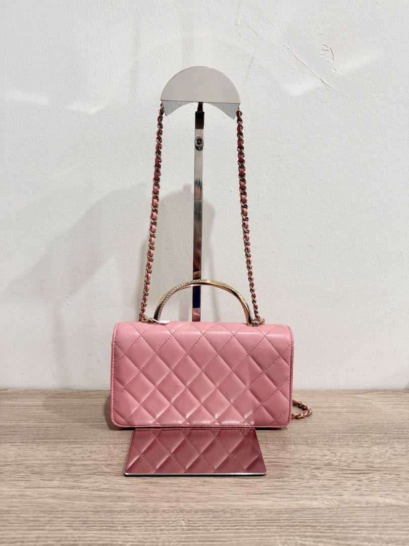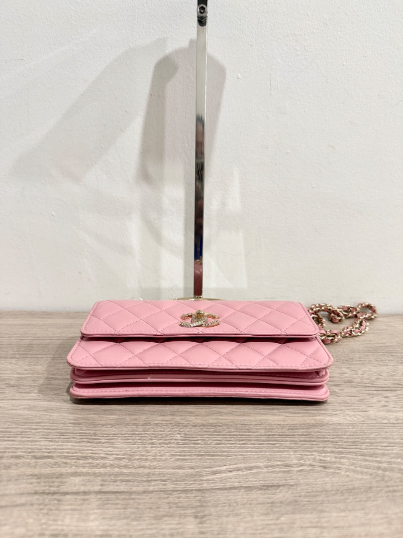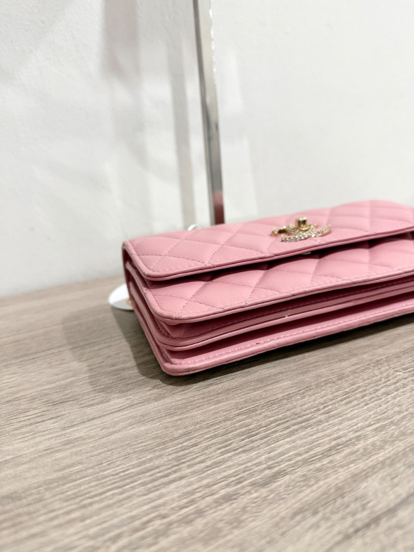 Chanel Quilted Leather Crystal Embellished Clutch Handbag with Chain Strap Pink