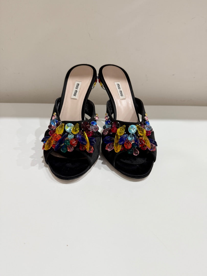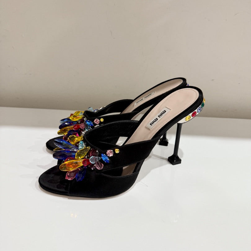 Miu Miu Crystal Embellished Metal Heel Satin Mules Heel Black Women's Size EU 41