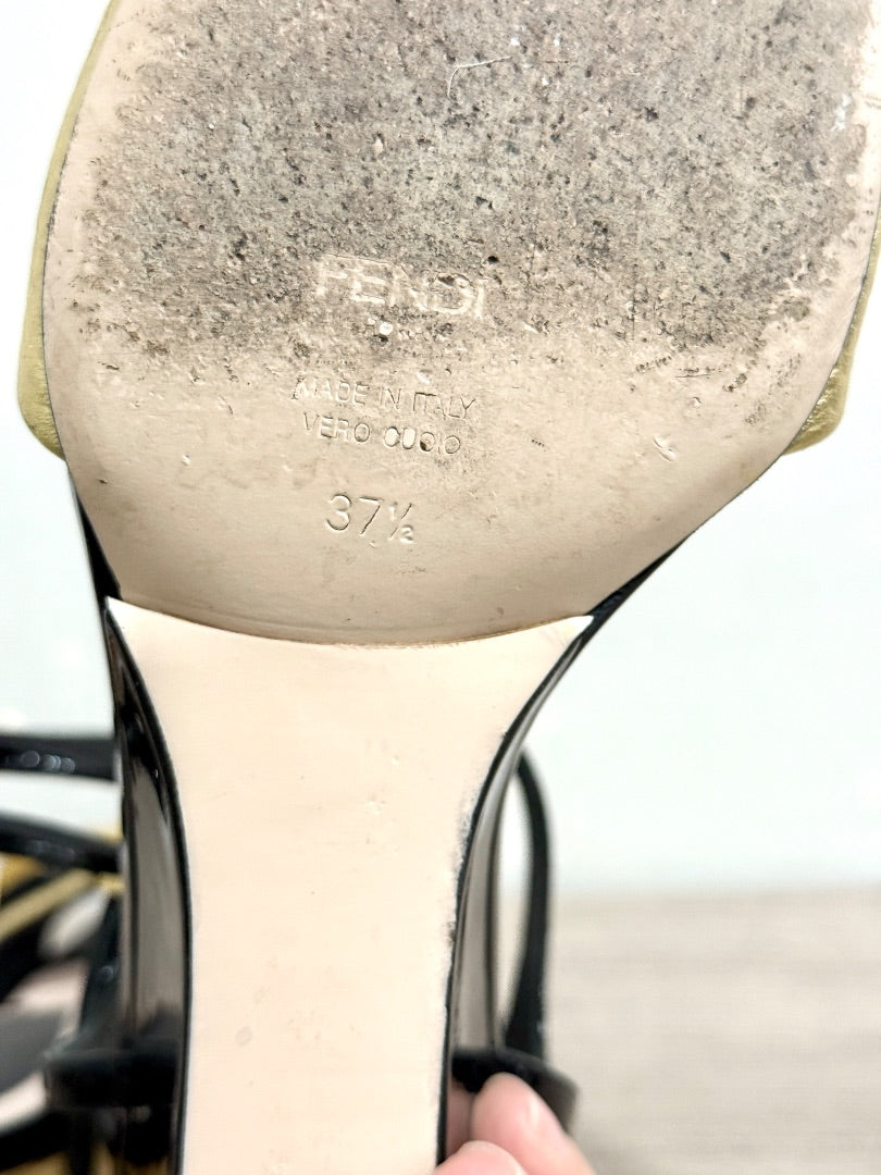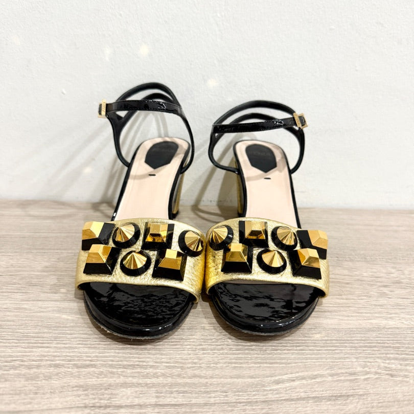 Fendi Studded Metallic & Patent Leather Heeled Sandals Black/Gold Womens EU 37.5