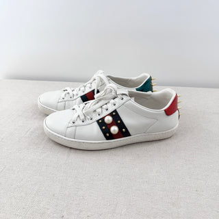 Gucci Ace Leather Sneakers with Pearl and Spike Embellished White Women's EU 36