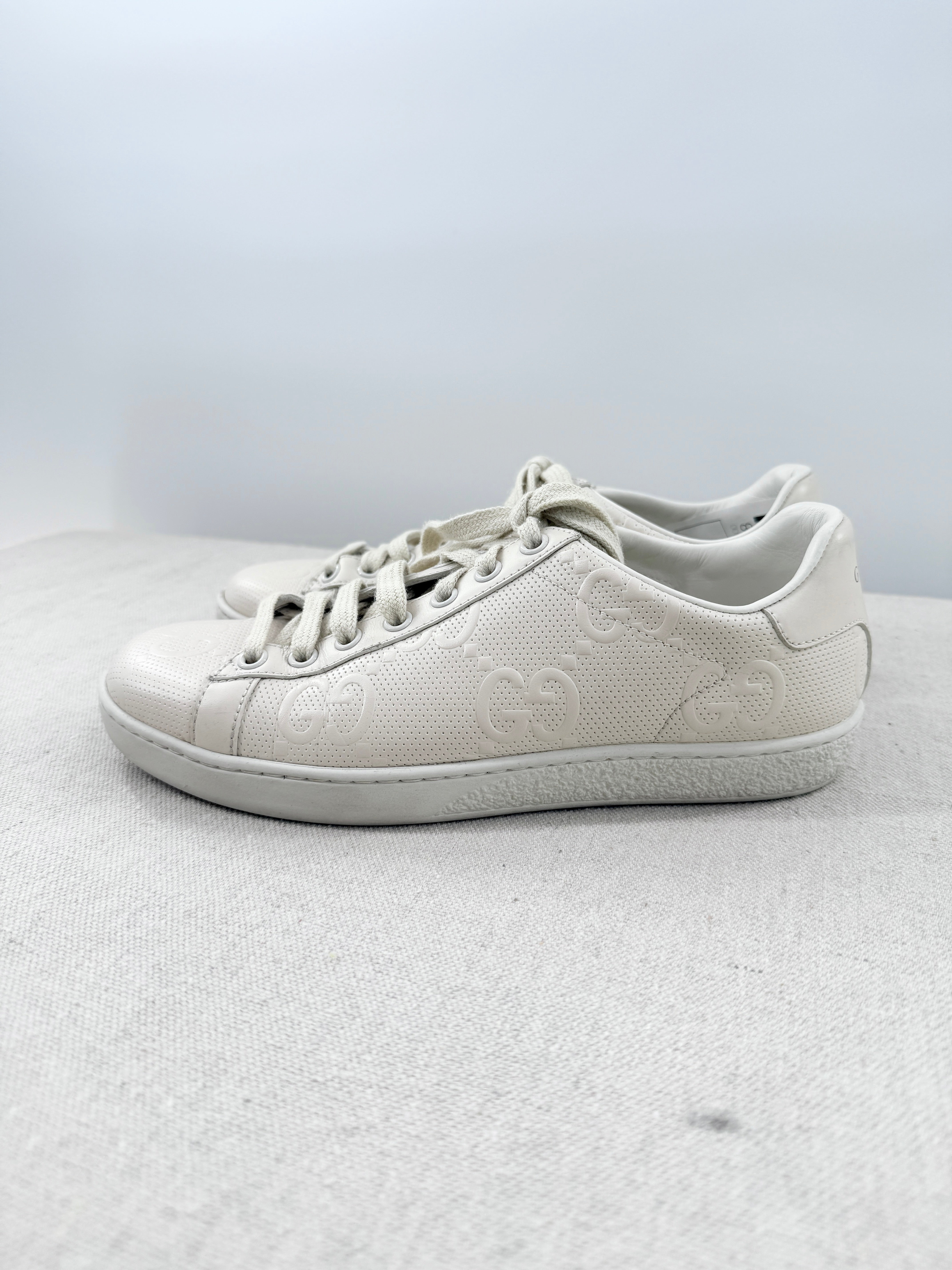 Gucci Ace sneakers, GG embossed leather sneakers, Gucci low top sneakers, cream Gucci sneakers, Gucci designer sneakers, luxury leather sneakers, Gucci Ace shoes, casual designer sneakers, iconic GG pattern sneakers, stylish Gucci trainers, women's Gucci footwear, premium leather sneakers, fashion luxury sneakers, Gucci Ace embossed sneakers