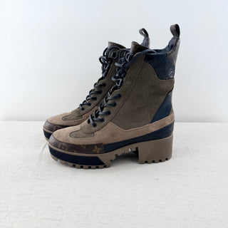 Louis Vuitton Suede Calfskin Monogram Laureate Platform Desert Boots Taupe EU 38