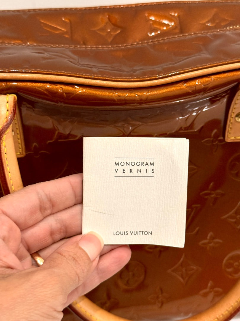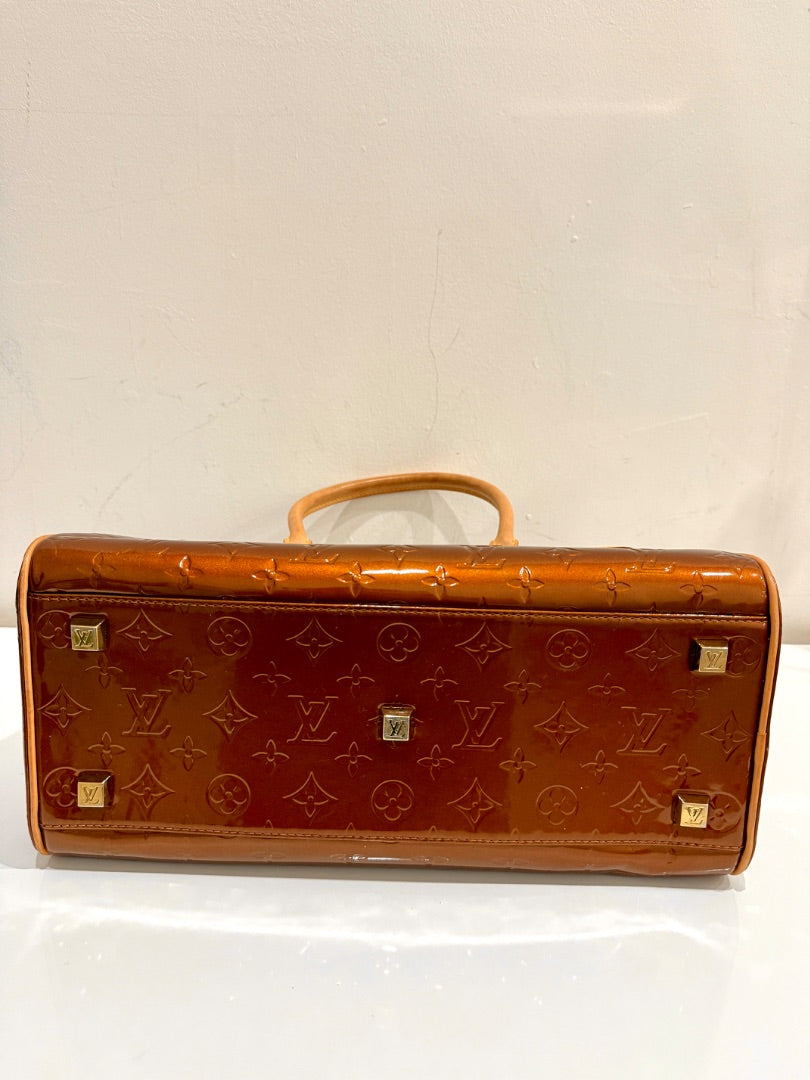 This structured handbag is crafted from glossy monogram patent leather in rich brown, blending timeless Louis Vuitton elegance with a modern, polished finish.