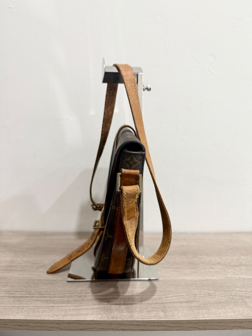 has discoloration and spots on vachetta (strap and trims, see photos), leather creasing,'interior clean