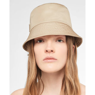 NWT Prada Milano Re-Nylon Metal Triangle Logo Womens Bucket Hat Beige Khaki M