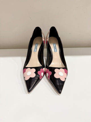 Prada Orchidea Nappa Leather Flower Fiori 85mm Pointed Toe Pump Black EU 40.5