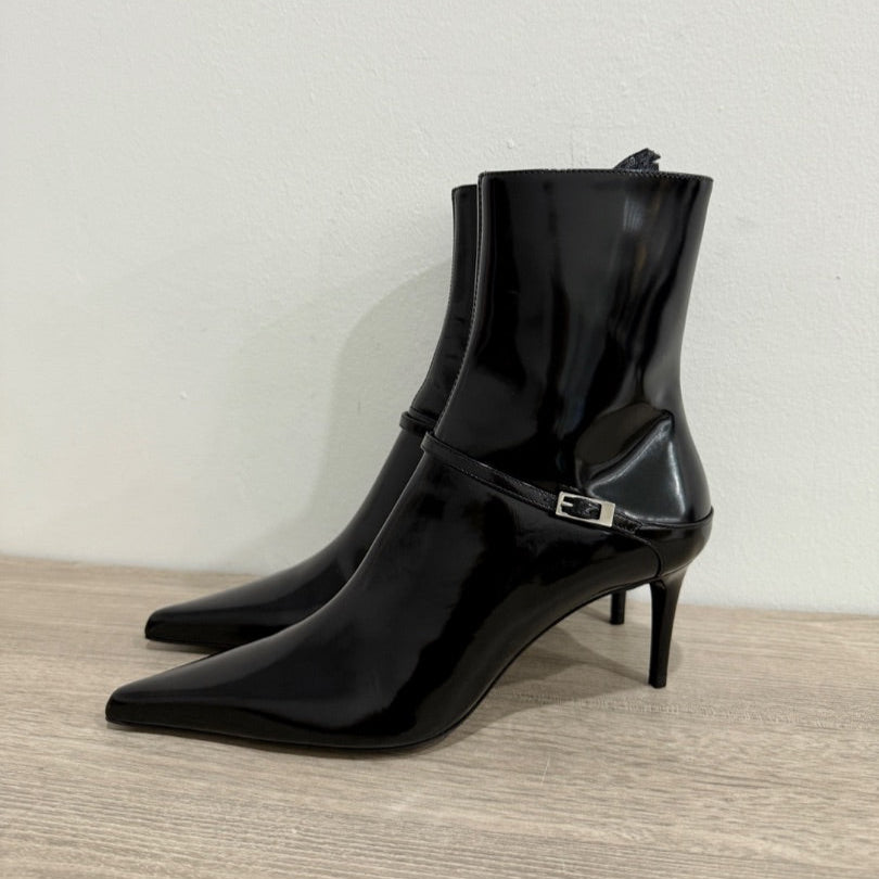 festive, concert, y2k, preppy, streetwear, runway, stylish, trendy, going out, city girl, party, night out, leather, heels, office, work, career, pointed toe, ankle boots, party, minimalist, patent leather