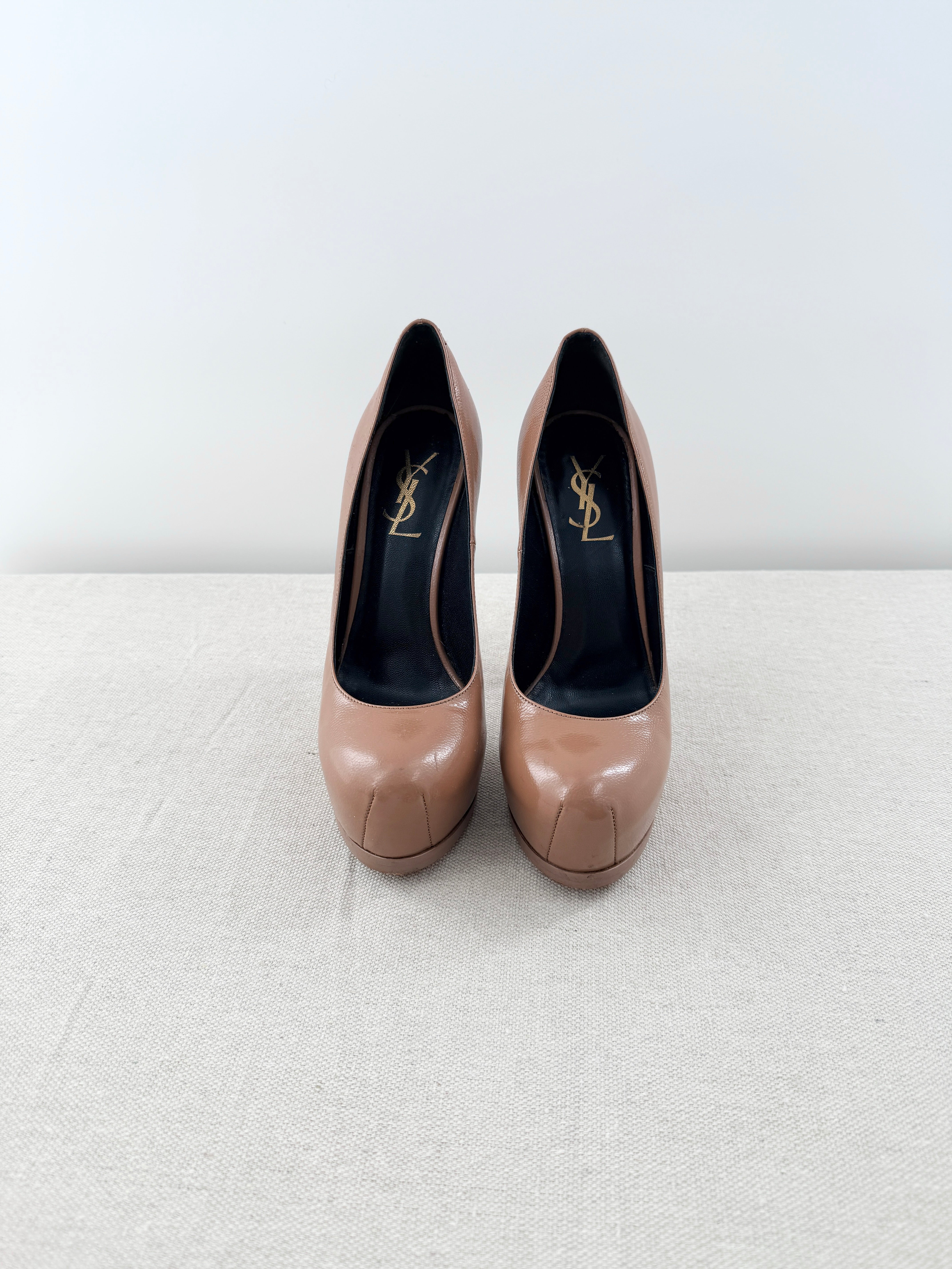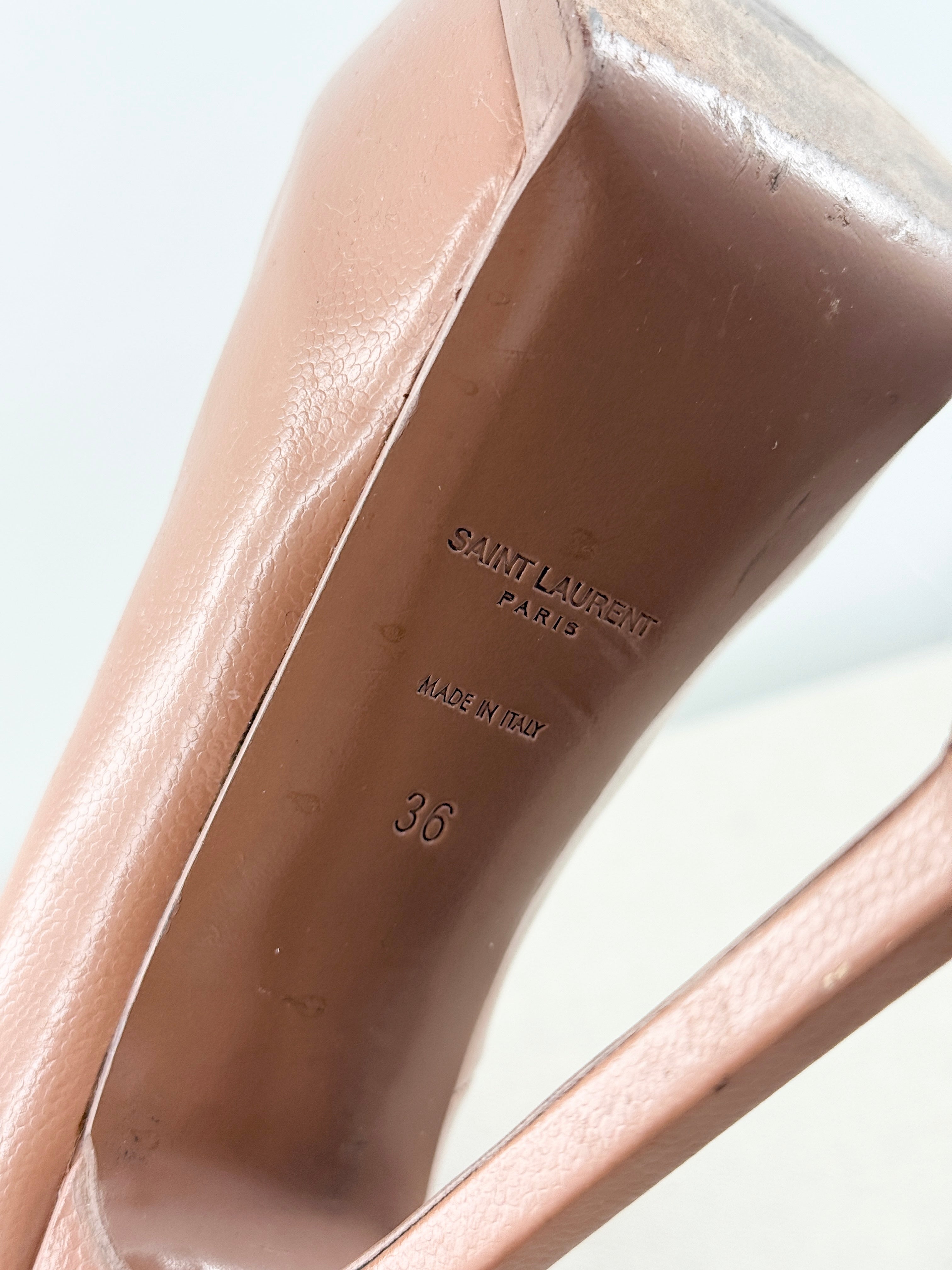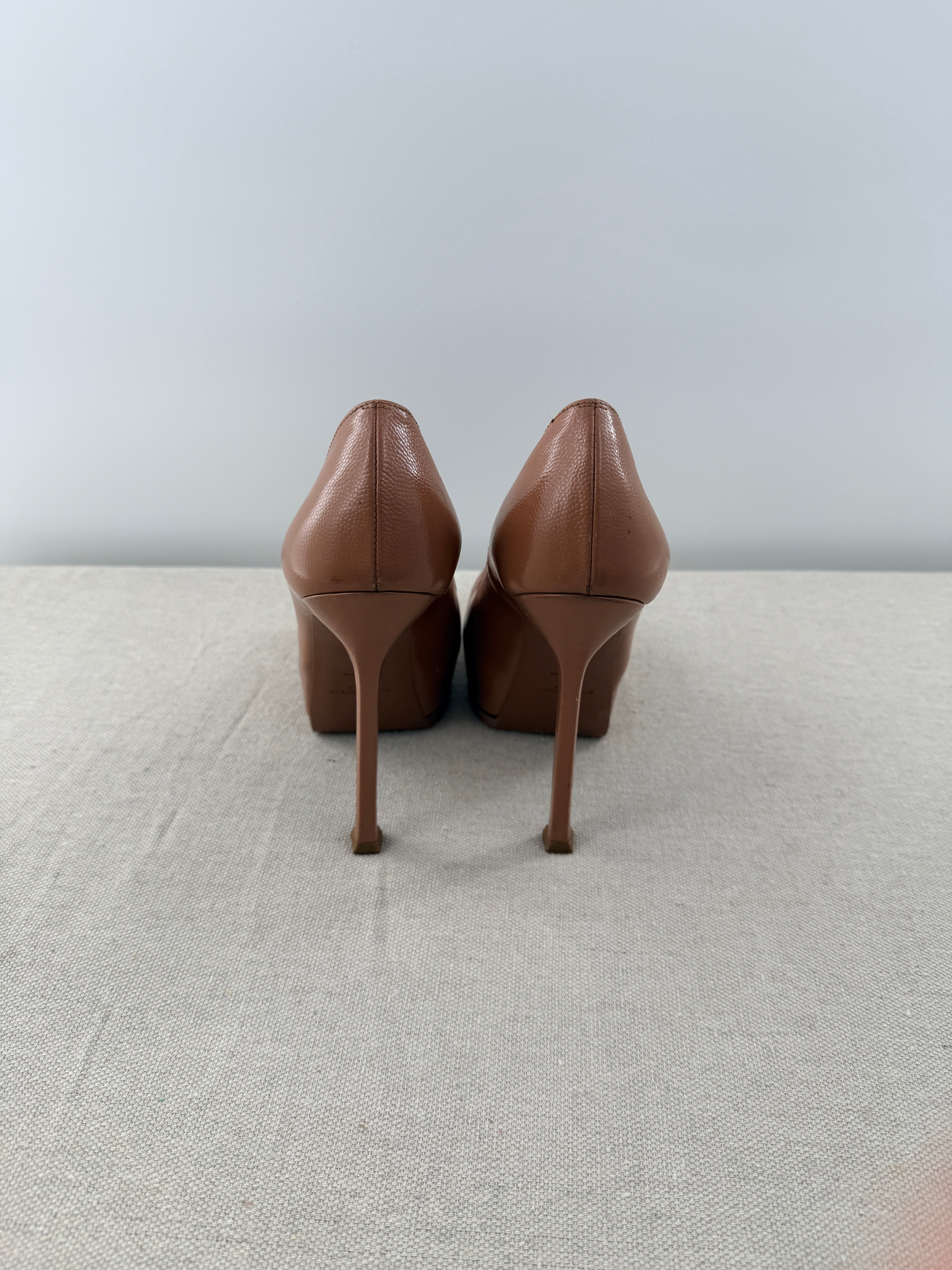YSL Yves Saint Laurent Tribute Two Platform Pumps Neutral Pebbled Leather EU 36