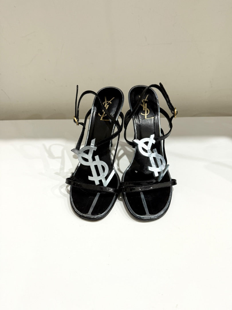 Saint Laurent YSL Patent-Leather Heeled Slingback Sandals Black Women's EU 37