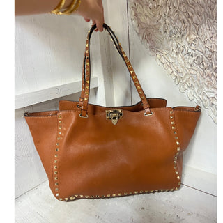 Valentino Garavani Rockstud Pebbled Leather Medium Tote Handbag Brown