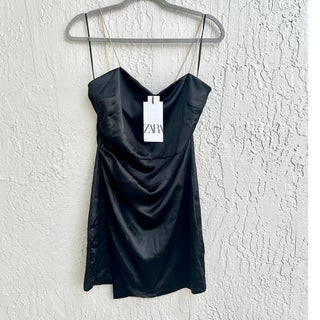 NWT Zara Spaghetti Strap Satin Ruched Mini Dress Black Women's Size Medium