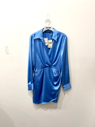 NWT Zara Satin Draped Neck Collar Wrap Mini Dress Light Blue Women's Size Medium