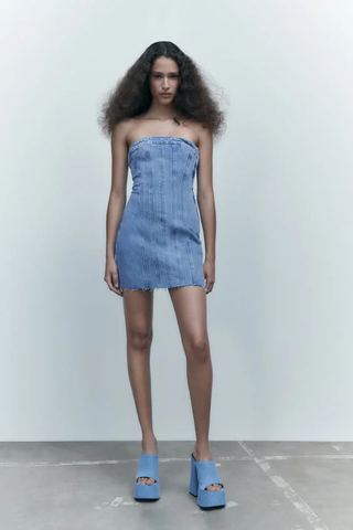 Zara Cotton Blend Strapless Bandeau Raw Hem Denim Mini Dress Blue Womens Size XS