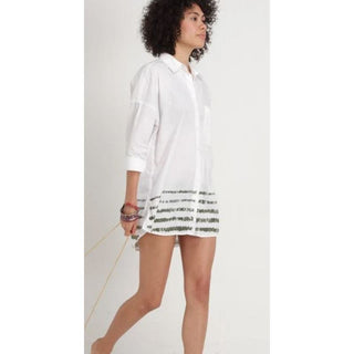 Zara Hi Low Hem Oversized Green Painted Stripe Button Down Shirt White Womens M