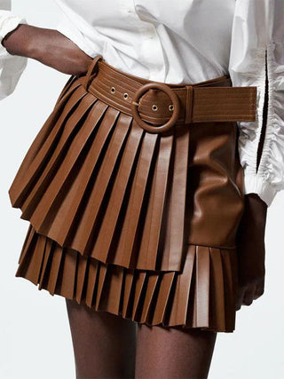 Zara Faux Leather High Waisted Belted Pleated Mini Skirt Brown Women's Size M