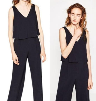 Zara Sleeveless Layered Crepe One Piece Jumpsuit Navy Blue Women's Size Large