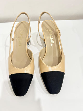 Chanel Colorblock Leather Block Heel Slingback Pump Sandals Cream/Black 36/US5.5