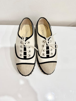 Chanel Cotton Lace Up Casual Espadrilles Light Beige Women's Size 37 / US 7