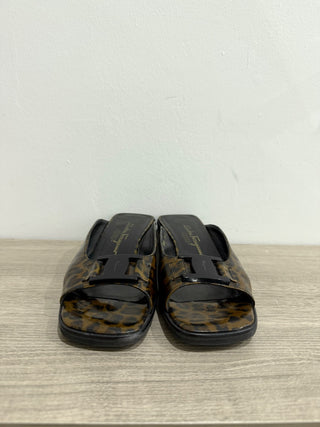 Salvador Ferragamo Leopard Print Slip On Wedge Slides Sandals Brown/Black 7.5