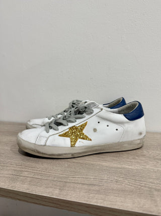 Golden Goose Super-Star Distressed Sneakers White and Blue w/ Gold Star EU 40