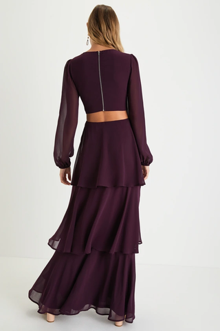Lulus Garden Bliss Cutout Long Sleeve Tiered Maxi Dress Plum Purple Women's XL