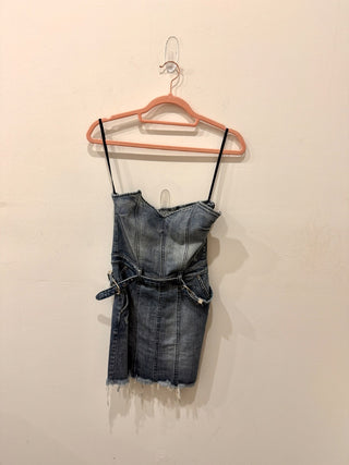 Retrofete Ashlyn Strapless Belted Raw Hem Denim Mini Dress Sea Blue Women's XS