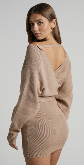 Showpo Don't Fall Down Long Sleeve Faux Wrap Knit Mini Dress Camel Womens Size 2